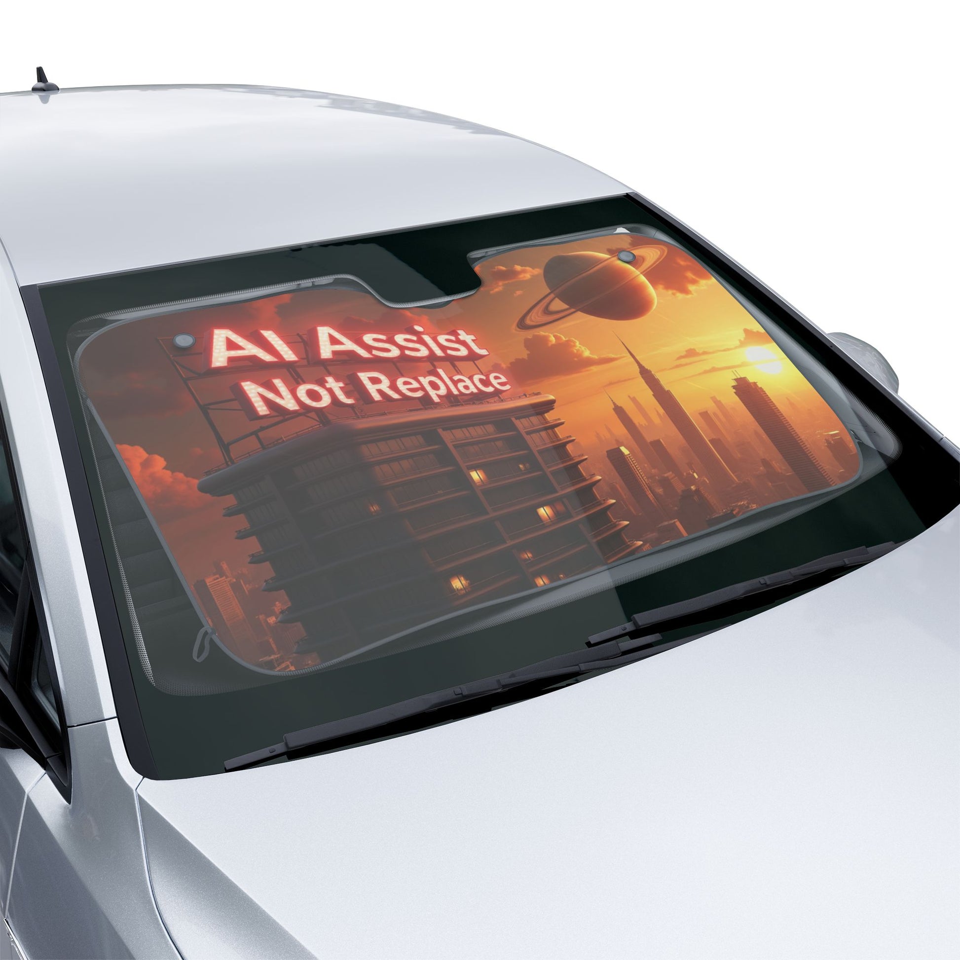 This sun shield is a declaration for the road. "AI: Assist, Not Replace" is not a playful slogan—it is a boundary. Against a backdrop of a futuristic cityscape, it states a core tenet of our movement: technology must remain a tool of human will, not become its master.