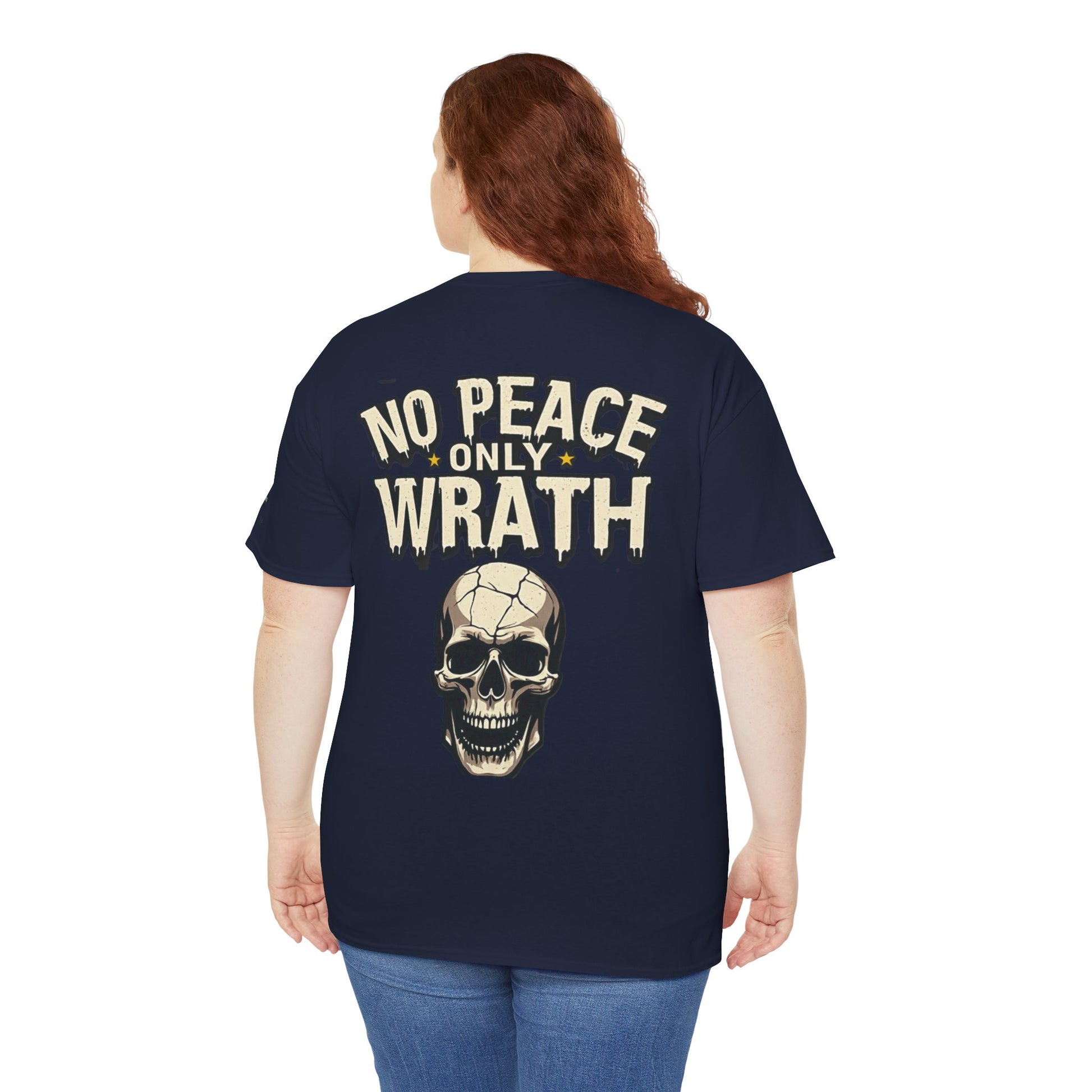 The other side, featuring a skull with the phrase "NO PEACE ONLY WRATH," amplifies this sentiment—it represents the relentless, unwavering resolve of those who demand justice. There is no comfortable truce with corruption; only the focused, righteous wrath that restores balance.